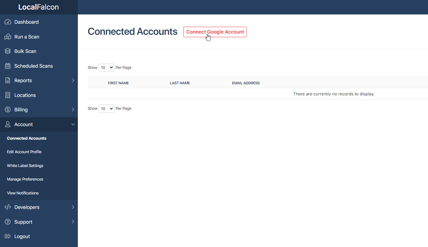 - After you give Local Falcon authorization, you'll be taken back to the "Connected Accounts" page in Local Falcon, where the Google Account you just connected should now appear.